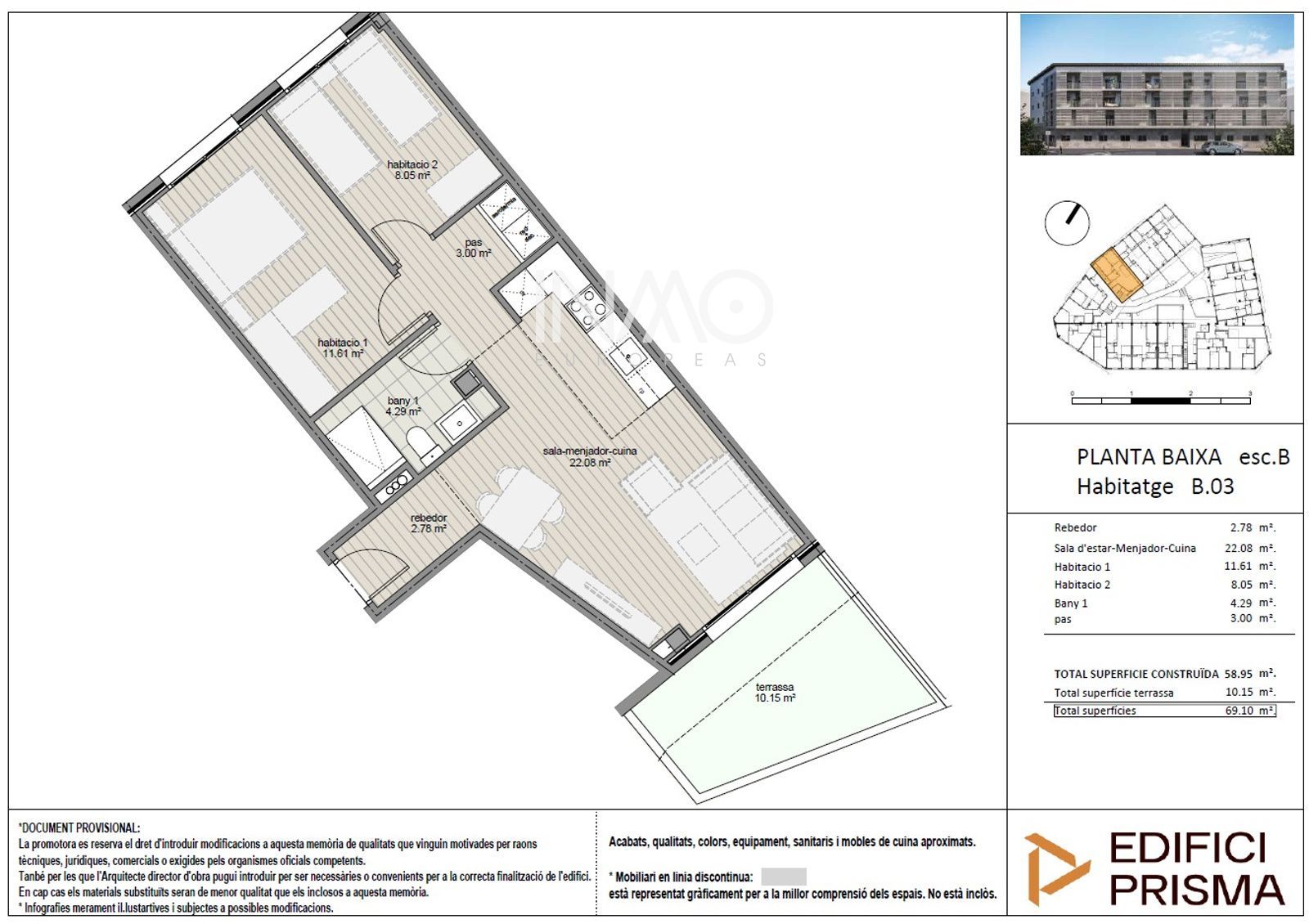 Ref. 1535 Superficie 69,10 m2 Terraza 10,15 m2 Habitaciones 2 Baños 1